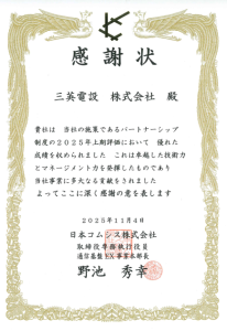 2025年11月4日、日本コムシス様のパートナーシップ制度の2025年度上期評価において、